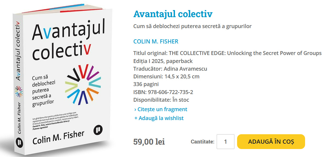 În „Avantajul colectiv”, Colin Fisher transformă ani de cercetare despre dinamica de grup într-un ghid practic despre cum pot funcționa echipele la cel mai înalt nivel. Pornind de la studii de caz din business, design, sport și cultură pop, cartea explică cum pot grupurile să concureze sănătos fără să alunece în conflicte disfuncționale și de ce performanța colectivă depinde mai puțin de discursuri inspiraționale și mai mult de structuri, reguli și procese bine gândite. Scopul cărții e să înțelegem și să lucrăm conștient cu forțele invizibile care apar atunci când oamenii lucrează împreună.