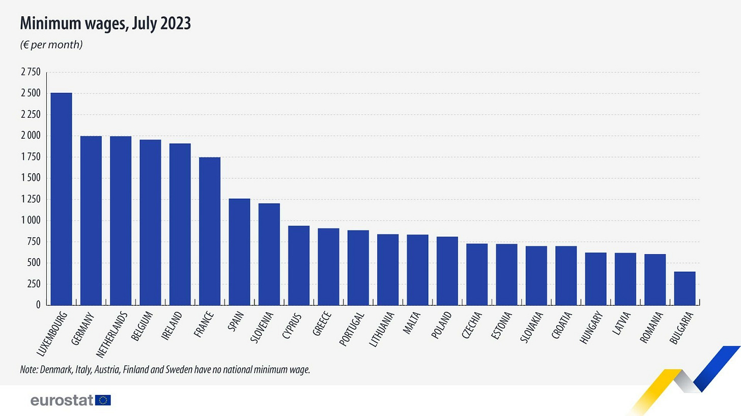 România are al doilea cel mai mic salariu din Uniunea Europeană, după Bulgaria, însă rata medie anuală de creștere între iulie 2013 și iulie 2023 a fost cea mai mare, de 12,9%, arată cele mai recente date publicate de Eurostat. În iulie 2023, salariile minime brute din statele membre ale Uniunii Europene variau de la 399 de euro pe lună în Bulgaria la 2.508 euro pe lună în Luxemburg.