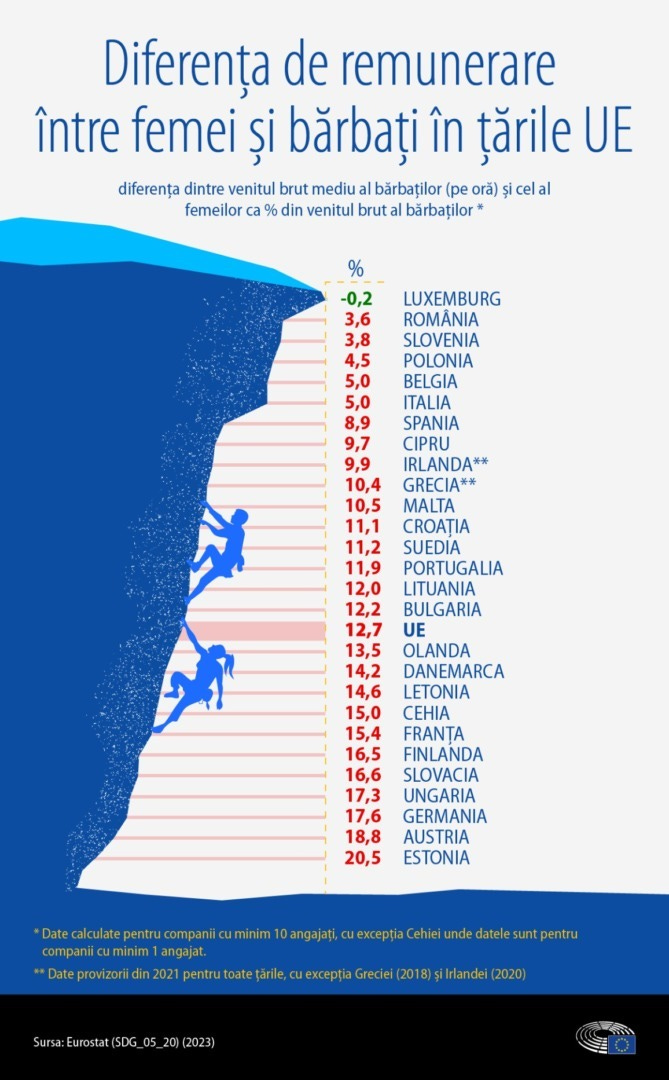 România este țara din Uniunea Europeană cu cea mai mică diferență de remunerare între femei și bărbați, conform Eurostat. Din cele mai recente date, femeile din UE câștigă în medie cu aproape 12,7% mai puțin pe oră decât bărbații. De asemenea, diferențele salariale variază în funcție de mediul de activitate – privat și public. În cazul României, un bărbat câștigă cu 1,7% mai mult pe oră în mediul public, în timp ce în mediul privat diferența ajunge la 10,2%.