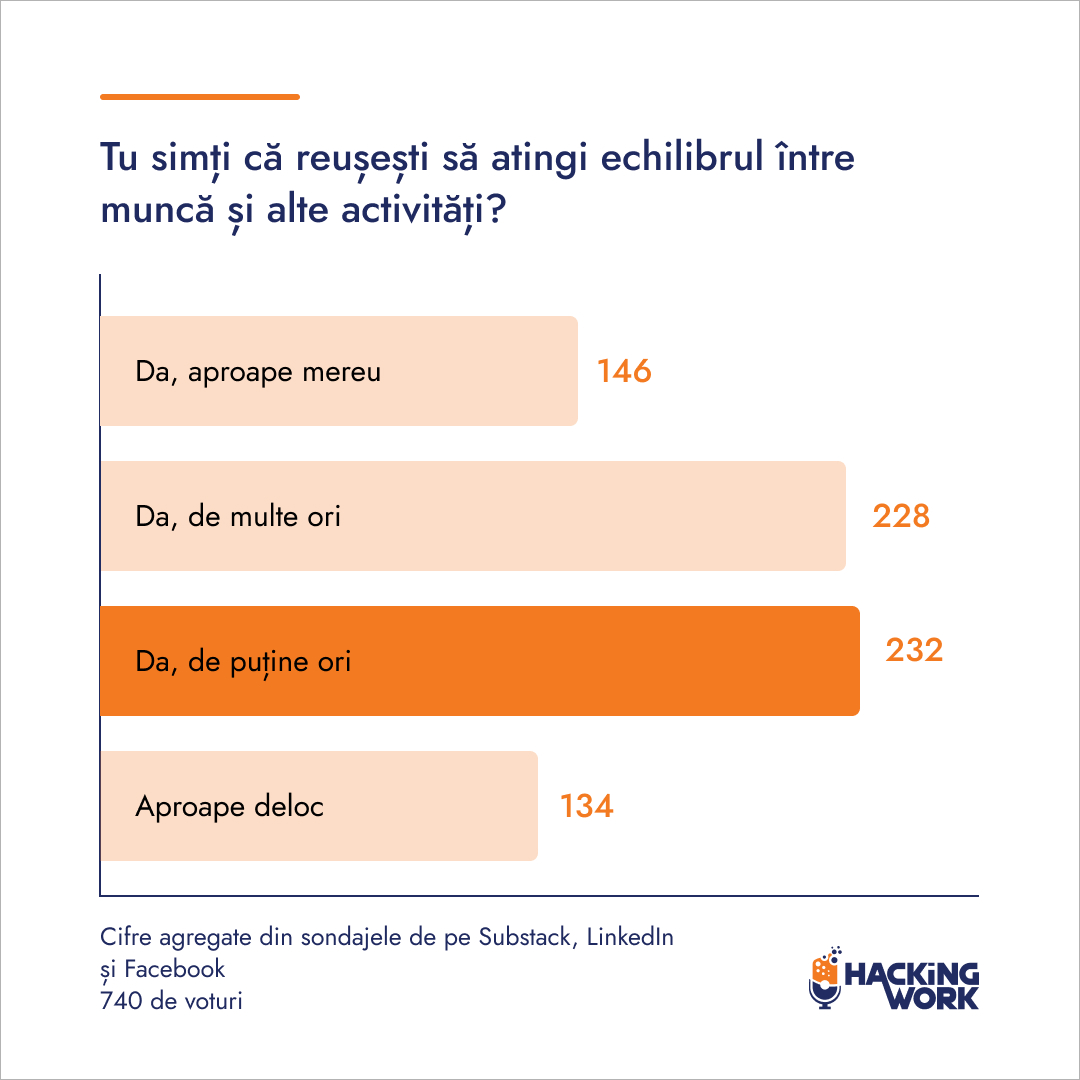 Pentru mulți români, echilibrul dintre muncă și alte activități este fragil, doar jumătate fiind mulțumiți de modul în care își gestionează viața profesională și cea personală. În urma sondajului pe care l-am publicat în ediția 79 a newsletter-ului și pe rețelele de socializare, putem concluziona același lucru: din cei 740 de respondenți, 366 reușesc rar sau aproape deloc să atingă acel echilibru, în timp ce aproape la fel de multe persoane (374) spun că reușesc să echilibreze adesea munca cu celelalte activități.